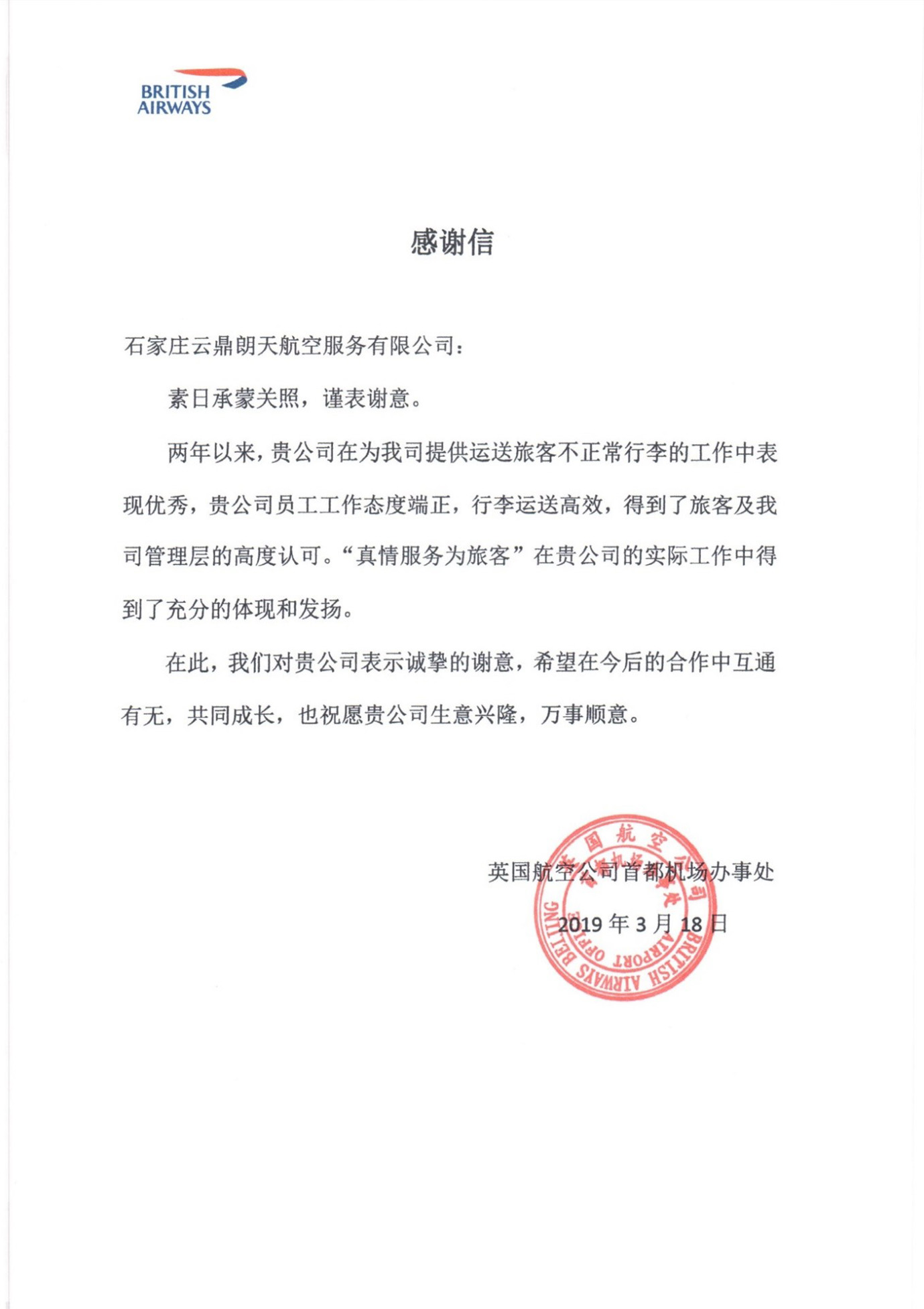 英国航空公司感谢信