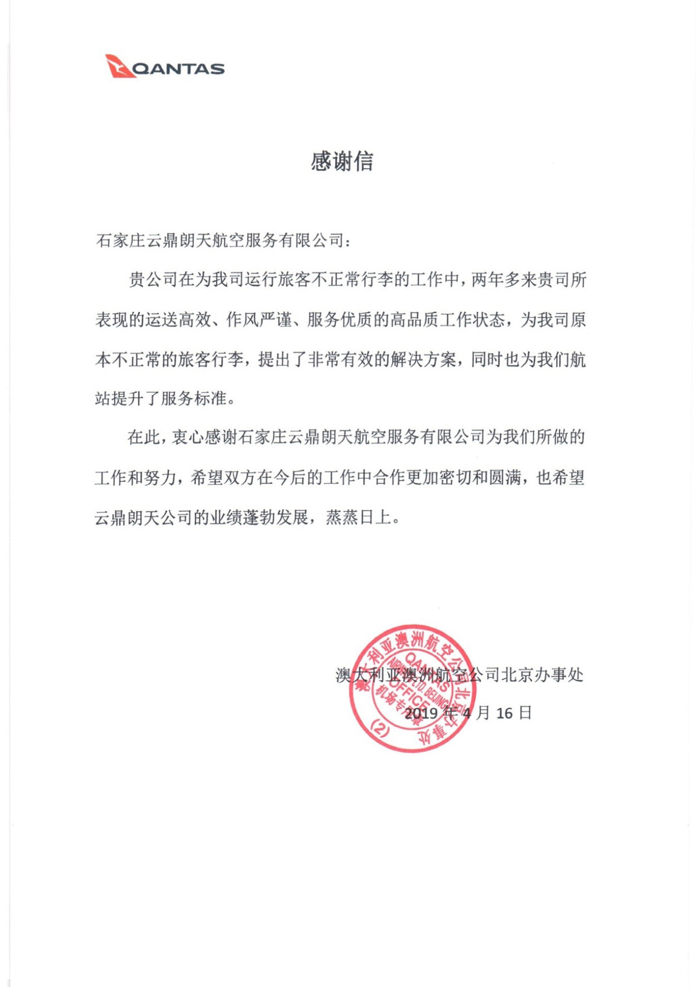 澳大利亚航空公司感谢信