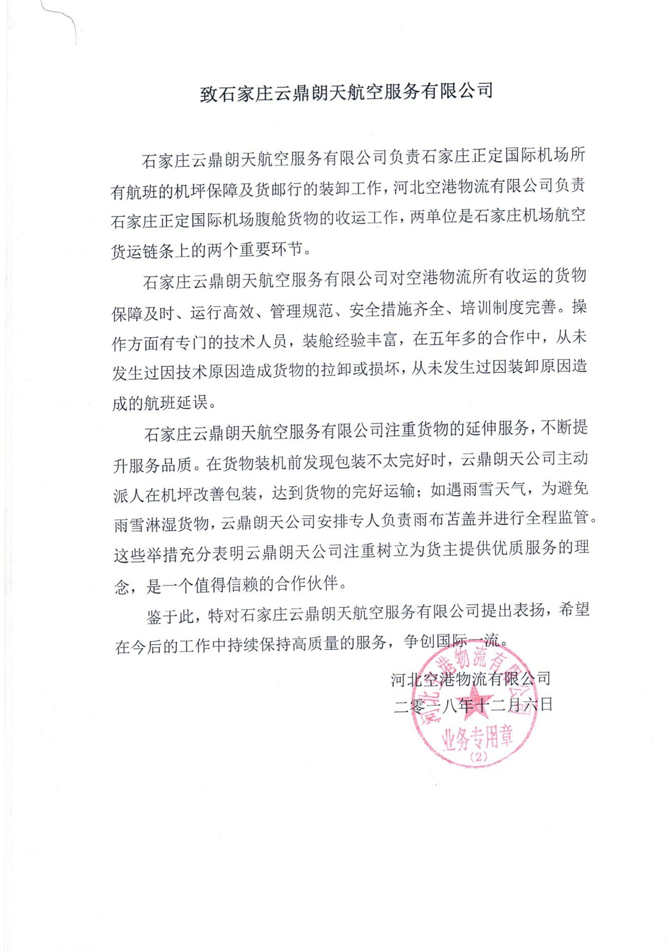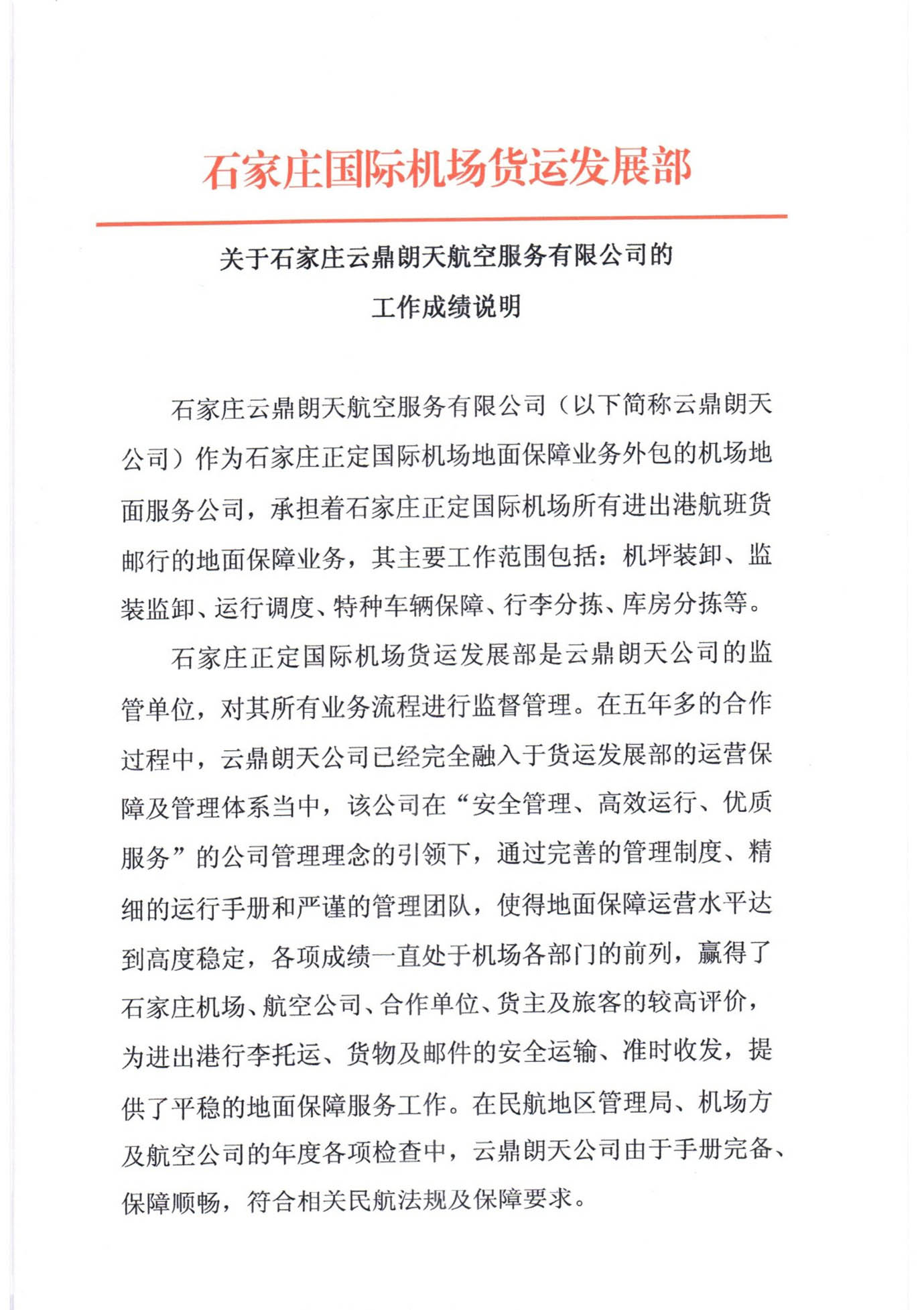 石家庄正定国际机场货运发展部关于石家庄云鼎朗天航空服务有限公司的工作成绩说明