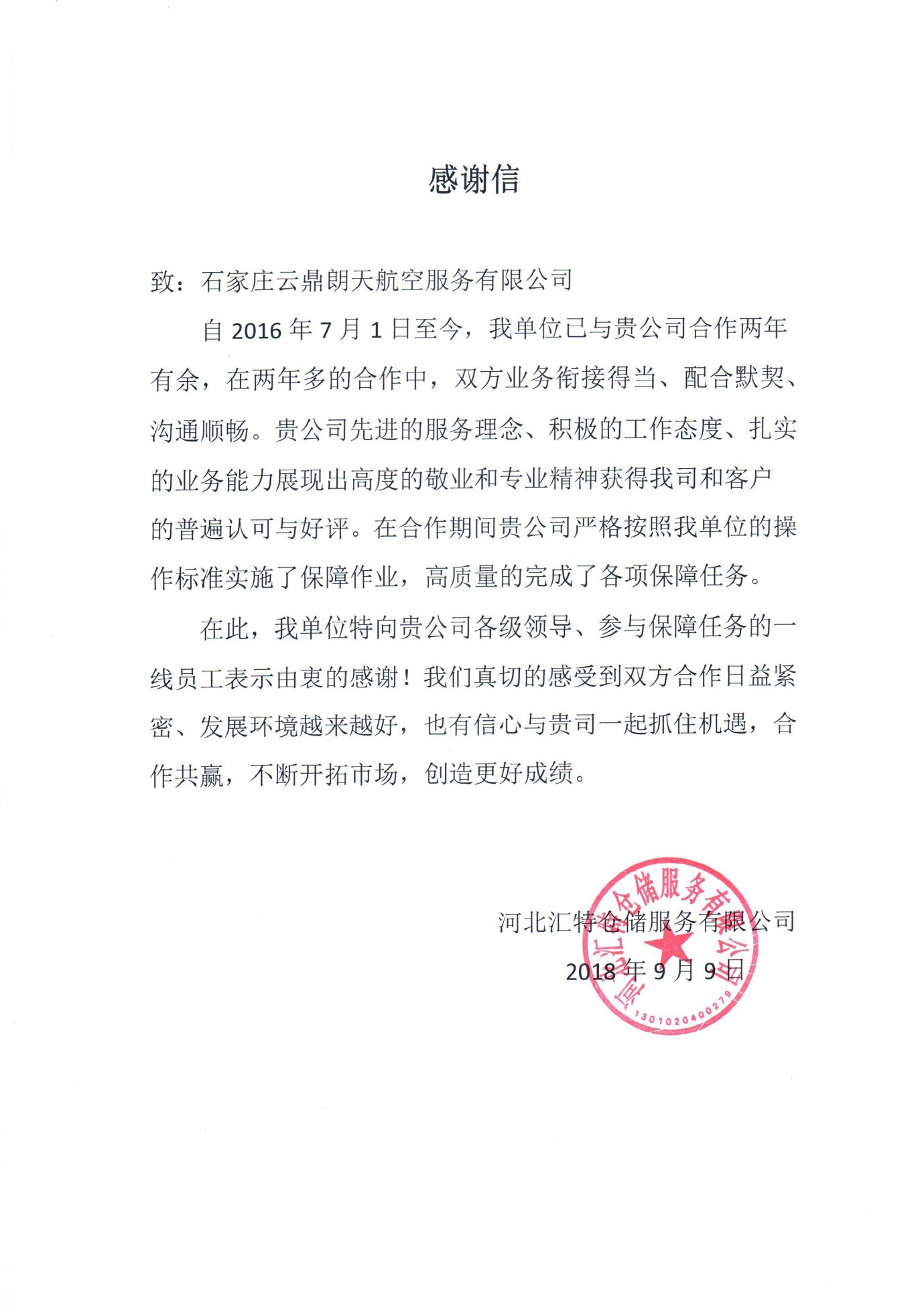 河北汇特仓储服务有限公司感谢信